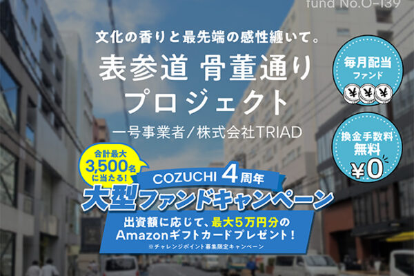 COZUCHIは「想いと豊かさを循環させる不動産投資」をコンセプトとした、ミドルリスク・ミドルリターンの不動産投資型のクラウドファンディングサービスです。 各プロジェクトごとに共同出資者を募集し、不動産事業で得られた賃料や売却利益を出資者のみなさまへ還元します。リスクの低い優先劣後構造で、債券や社債等より高いリターンの提供と実現を目指しています。